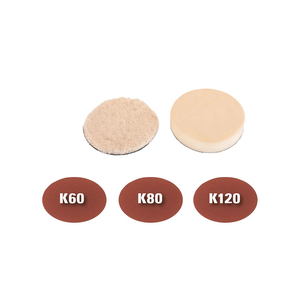 Brusni disk opremljen je specijalnim učvršćivačem za spajanje i kako bi se diskovi za poliranje i brušenje sigurno učvrstili na električnoj polirci i spriječili ulazak prašine između diska i brusnog papira. Priključci za poliranje i brušenje su lako i brzo mogu promijeniti. Sveobuhvatni pribor za poliranje i brušenje sastoji se od 1 pričvršćivača za spužvu za npr. poliranje automobila, 1 sintetičke krpe za poliranje i brusnog papira od 60, 80 i 120 granulacije s po 1 svaki.