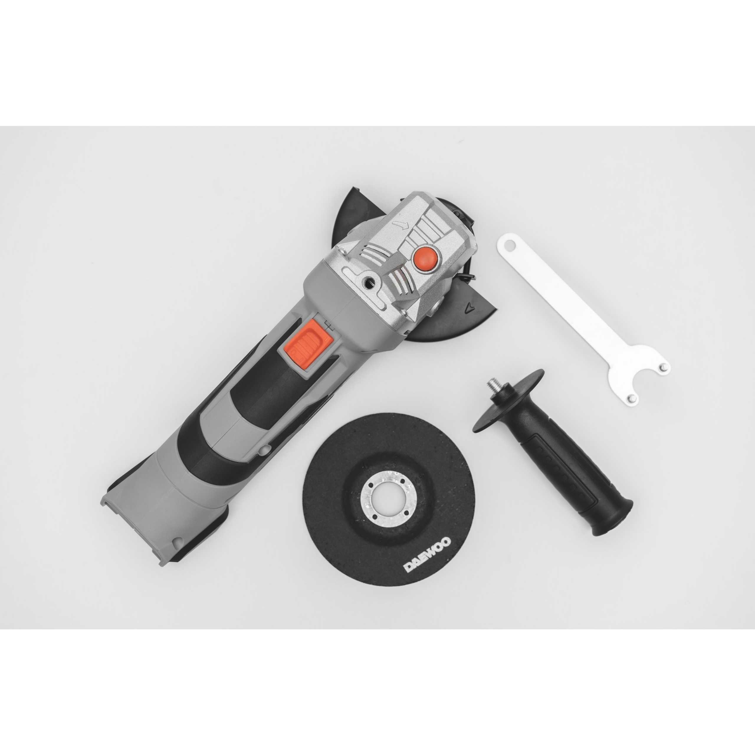 Daewoo kutna brusilica 125mm DALAG18-125-1 18V savršen je alat za DIY entuzijaste i profesionalce. Kao rezultat DAEWOO korejske tehnologije i inženjeringa, kućište je izrađeno od robusnog, ali laganog aluminijskog materijala, kako bi se osiguralo da čak i sa snažnim motorom od 18 V, uređaj teži samo 1,49 kg (bez baterije i diska). Na najvažnijim dodirnim točkama ručka je prekrivena materijalom protiv prianjanja za udobno i jednostavno rukovanje. Zaštitnik diska od 180 stupnjeva koji se lako zaključava podesiv je u bilo kojem kutu i može se ukloniti radi čišćenja. Za sigurnost uređaj je opremljen mekim pokretanjem, funkcijom sigurnog zaključavanja i gumbom za pokretanje u 2 koraka. Kao dio serije DAEWOO U-FORCE, savršeno radi s izmjenjivim DAEWOO litij-ionskim baterijama, trenutno dostupnima u veličinama od 2,0 Ah i 4,0 Ah. Jedna baterija za sve vaše proizvode serije DAEWOO U-FORCE. Lakoća rukovanja i jednostavnost čak i za najteži rad. Proizvod dolazi s diskom od 125 mm, uklonjivom dodanom ručkom i ključem za disk.