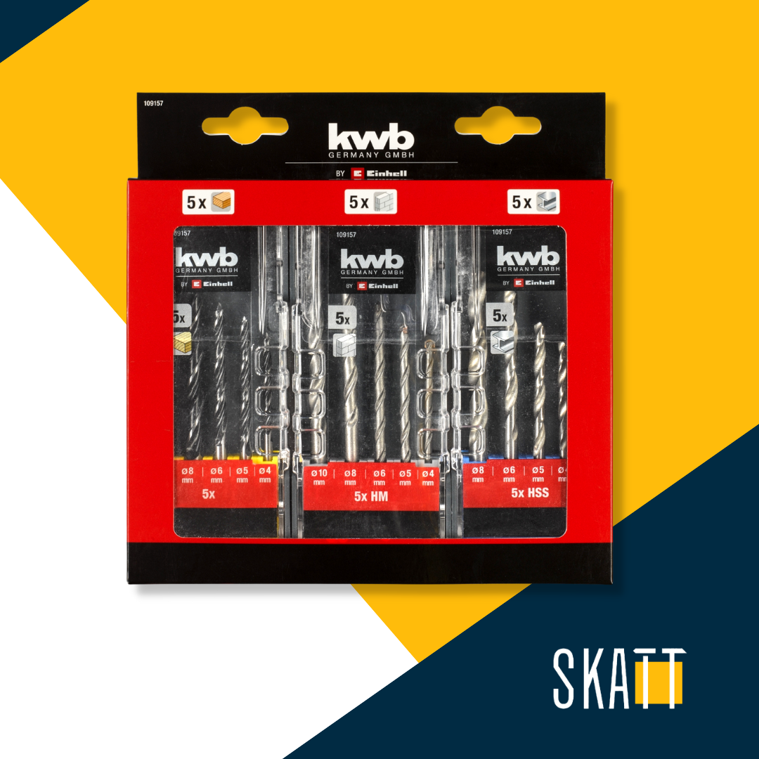Set od 15 svrdla za tri različita materijala koja su potrebna za svaki rad. Odjeljena u tri kutije sa sigurnim zatvaračem i plastičnom kukom omogućuju jednostavno skladištenje. Za nesmetani rad sa električnim i akumulatorskim bušilicama pobrinuo se klasični prihvat na svakom svrdlu.